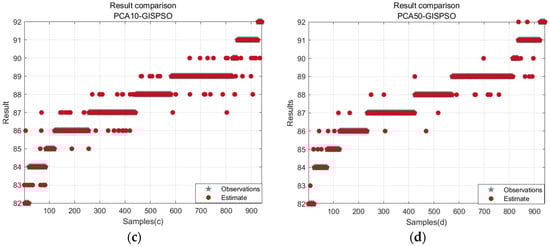 Comparison Scatterplot. (a) Full band optimization prediction result; (b) CARS feature selection prediction result; (c) PCA downscaling 10 principal component prediction result; (d) PCA downscaling 50 principal component prediction result.