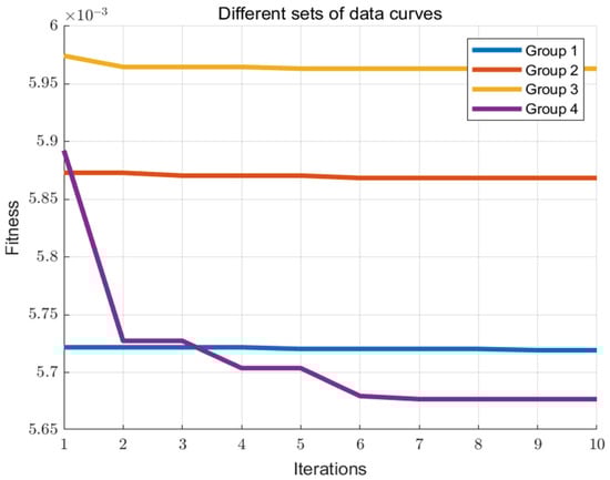 When dealing with different problems, the parameter range settings, which are usually derived empirically, can have a significant impact on the final optimization results. Too narrow a range may limit the exploration, while too wide a range may lead to a significant expenditure of time and resources. As shown in Figure 10, the fitness curves for the first three sets of parameter ranges change very little and end the optimization search prematurely, with no further change in the fitness curves as the number of PSO iterations increases. This suggests that the algorithm’s parameter settings may not be optimally configured, thus limiting the effective exploration of the solution space, or that the algorithm has converged to a local or global optimum.