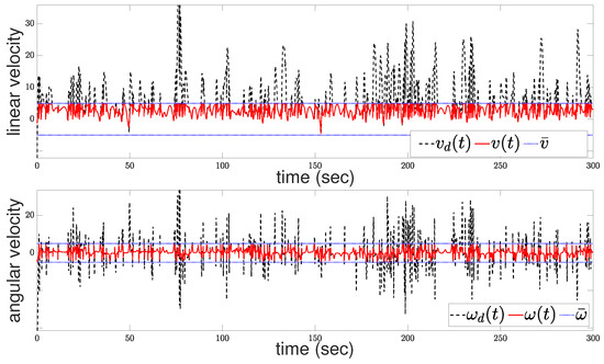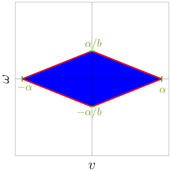 where v and represent the linear and angular velocities, respectively. These velocities are the control inputs of the system, denoted compactly as . Due to physical limitations, the robot’s combined motion is constrained within the following compact set: