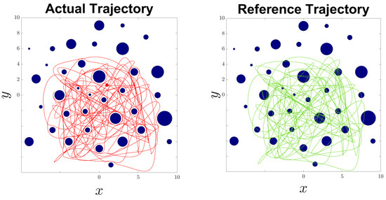 The reference trajectory was generated using the MATLAB function, which constructs a cubic spline interpolating a sequence of points within the 2D workspace. As shown in the right subfigure of Figure 3, the reference trajectory may pass through obstacles. However, the left subfigure in Figure 3 demonstrates that the actual trajectory of the robot, controlled by the proposed scheme, remains collision-free while closely following the reference path. This illustrates the effectiveness of the control scheme in ensuring safe navigation by dynamically adjusting to avoid obstacles while maintaining adherence to the desired trajectory as closely as possible. The robot’s ability to avoid collisions and track the reference path underscores the robustness and adaptability of the proposed control and estimation algorithm.