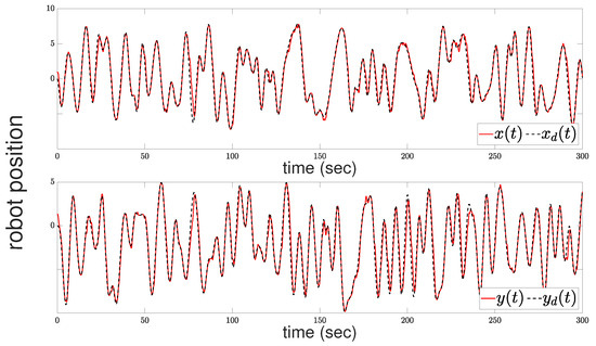Figure 4 illustrates the tracking performance of the robot’s center position with respect to the x and y axes. The upper subfigure shows the x-axis performance, while the lower subfigure displays the y-axis performance. In Figure 5, the evolution of the tracking error is depicted alongside the adaptive performance function governed by (13). The adaptive performance function plays a crucial role in regulating the output performance characteristics. It dynamically adjusts by widening whenever the robot faces the risk of collision and/or when the control input reaches the saturation limits. This relaxation mechanism ensures that the robot avoids collisions and guarantees the boundedness of the closed-loop signals.