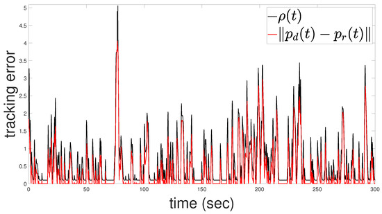 Additionally, system (1) obeys the input-to-state stability property; hence, it can be shown that remains bounded according to Theorem 1 in [34]. Subsequently, by invoking , we conclude that for all , ensuring adaptive performance tracking. Consequently, the boundedness of all closed-loop signals implies that , ensuring collision avoidance for all and completing the proof. □