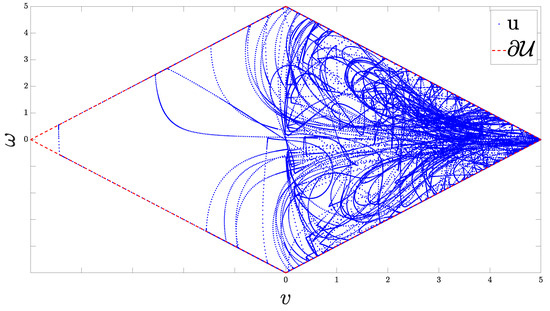 Figure 7 illustrates the actual control signal u plotted within the diamond-shaped compact set . This figure clearly demonstrates that the control inputs consistently remain within the feasible region defined by . The diamond-shaped boundary represents the input saturation constraints, which encapsulate the maximum allowable linear and angular velocities, which cannot be applied simultaneously. The control scheme ensures that the applied control effort respects these constraints at all times, effectively balancing the need for the output prescribed performance with the practical limitations of the robot’s actuators. This adherence to the feasible control set is crucial for the safe and reliable operation of the nonholonomic robot, preventing excessive control actions that could lead to instability or hardware damage.