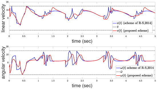 The control and performance parameters of the proposed scheme are identical to those listed in Table 1. The control parameters for the method described in [35] were fine-tuned to , , and , with the minimum allowable distance between the robot and obstacles set to . Additionally, the saturation levels for both schemes were set to . The resulting tracking performance for both schemes is depicted in Figure 9, while the corresponding control signals are illustrated in Figure 10. Note that the control signals generated by the proposed scheme are less aggressive than those from [35], while also the robot under the proposed controller achieves more accurate trajectory tracking. To further illustrate the superiority of the proposed controller, we provide a performance comparison using three indices that provide distinct insights into the system behavior. The Average Squared Error index (ASE) highlights faster convergence with lower values, emphasizing larger errors. Conversely, the Average Absolute Error index (AAE) indicates slower convergence, but with reduced oscillations. Lastly, the Total Energy Consumption index (TEC) quantifies energy efficiency, where lower values signify more efficient energy utilization during control operations. For a comprehensive analysis of the mathematical formulations underlying the performance indices, please refer to [36].