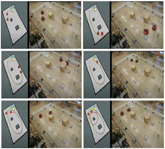 In this case study, an experiment was conducted in our lab to demonstrate the performance and robustness of the proposed control scheme in a real-world environment. This setting introduces various uncertainties, such as traction variability, measurement noise, and delays inherent in the actuating hardware when commands are issued to the robot. For this experiment, two AmigoBots were utilized, as shown in Figure 11. One robot served as the target, generating the reference trajectory, while the other robot was forced to track this trajectory. The entire experiment was implemented using the ROS framework and Python to control the robots. Both robots were equipped with LiDAR sensors and Odroid units (mini computers) running Ubuntu. The target robot moved within the workspace via tele-operation, simulating dynamic trajectory changes that the tracking robot had to follow.