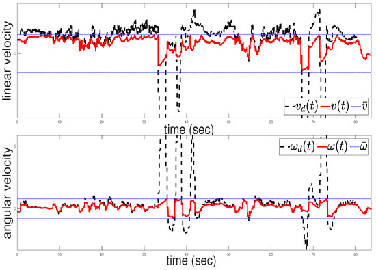 A video showcasing the real-world experiment and the tracking performance can be accessed via the following link: https://www.youtube.com/watch?v=Sty73Vd3SMQ (accessed on 2 June 2024). Figure 12 depicts the commanded velocity of the robot throughout the experiment. Notably, the upper subfigure in Figure 12 shows instances where the commanded linear velocity becomes abruptly negative at approximately the 35-th and 68-th seconds, resulting in backward motion. This behavior, observable in the linked video, is attributed to the presence of the virtual obstacle that significantly increases the collision avoidance term , preventing the robot from approaching the obstacle. This highlights the importance of selecting smaller control gains to enhance the system’s response in such scenarios. It can be concluded that, in the real-world scenario, the commanded velocities given by the control scheme are more oscillatory than those in the simulation study. This phenomenon can be attributed to practical constraints such as slip, as well as delays introduced by measurements, both of which hinder the algorithm’s performance, as expected.