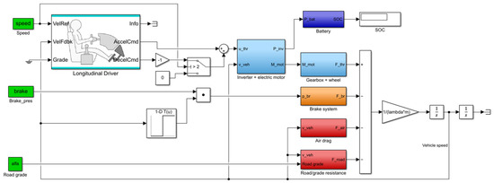 For the logically right operation, some complement functions have to be implemented into the model. At the same time, there should not be throttling or mechanical braking. Additionally, below 10 km/h, there should not be any regenerative braking. The block scheme of the model can be seen in Figure 2.