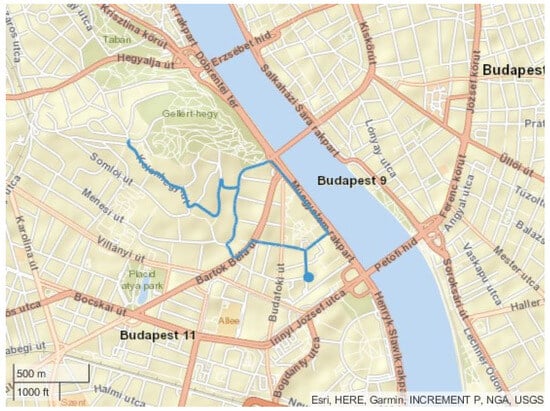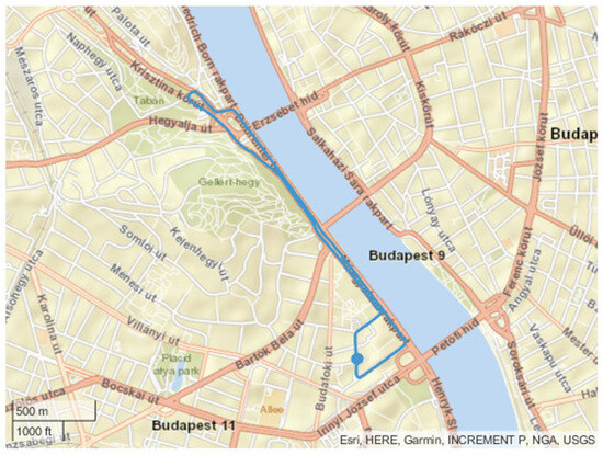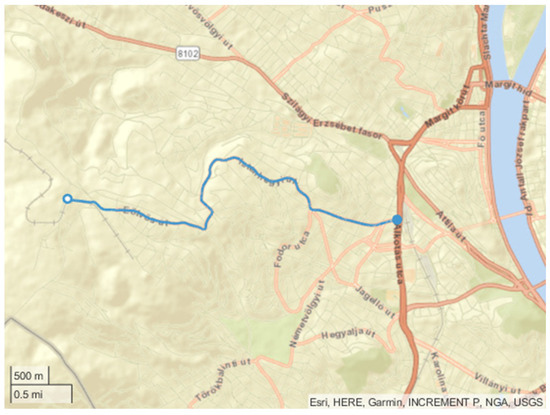The first applied route is called the “Erzsébet” cycle because it is between the BME University and the Erzsébet bridge along the river Duna. The route does not contain high elevation changes. The road grade changes are nearly negligible. The length is 4.7 km, and the maximum road grade is below 4%. Due to the traffic control lights, the cycle has several stops. The map of the route can be seen in Figure 3.