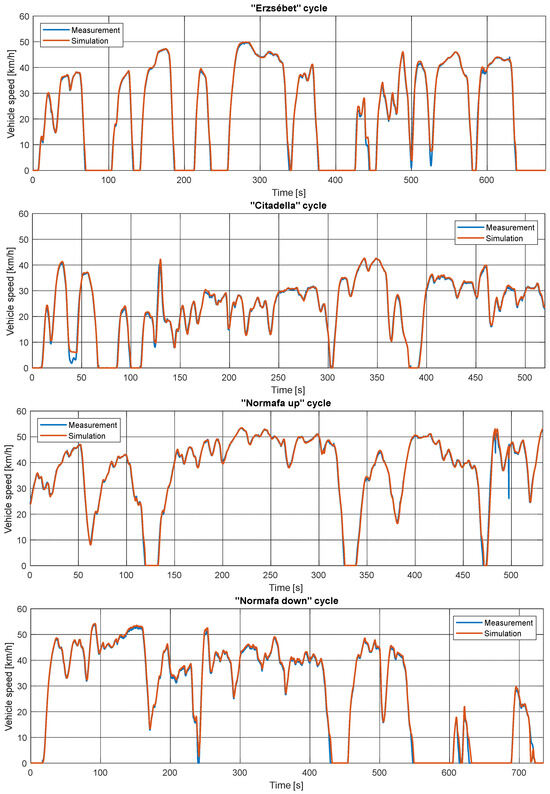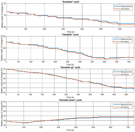 Finally, the high-voltage battery’s measured and simulated SoC changes in the different cycles are shown in Figure 12. The results were not used for validation because the battery SoC estimation of the vehicle should not necessarily be linear, as its characteristics are unknown. For instance, it can depend on the actual driving style. Apart from that, the diagrams demonstrate that the model can be calibrated to follow this signal accurately.