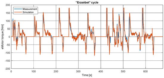 Measured and simulated efficiency of the electric motor during the “Erzsébet” cycle.