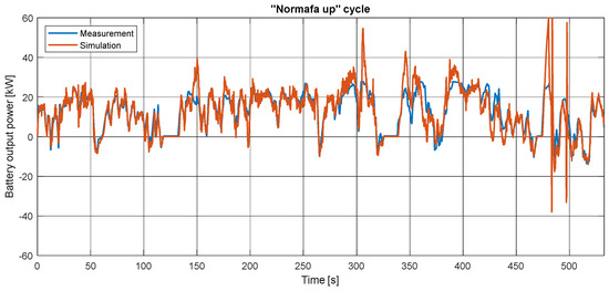 In the same measurement, the battery output power is depicted in Figure 11. The behavior is like the torque’s: it is verifiable but has inaccurate peaks and a nervous oscillation. At the last phase of the cycle, while the driving style is more aggressive, this inaccuracy increases. As earlier, the other results can be seen in Appendix C; they have similar properties.