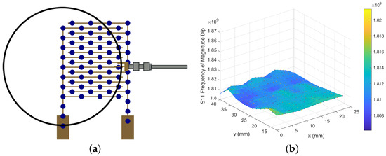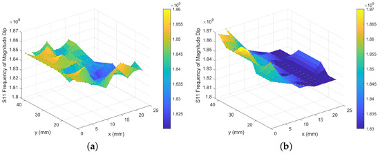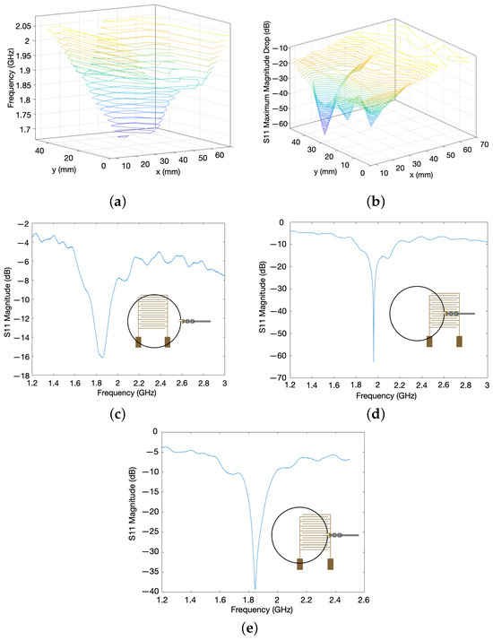 To achieve a maximum detection region, the sensor should be placed at the most central location, incorporating both the digits and the pads at x = 42.0 mm and y = 35.0 mm (Figure 3c); this however only provided a resonant frequency magnitude dip of −16.2 dB. The optimum magnitude dips of −63.0 dB are located at position x = 14.0 mm and y = 35.0 mm, providing very little coverage of the sensor, minimising the detection region (Figure 3d). In order to optimise both the magnitude dip and the detection region, a compromise is made with the measurement positions at x = 28.0 mm and y = 28.0 mm, bringing the antenna further up from the pads and centring it with the left-hand leg, resulting in a magnitude dip of −39.4 dB (Figure 3e).