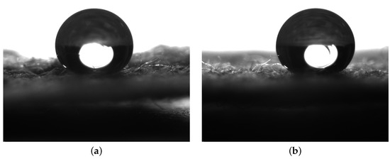 The Kapton tape waterproofing layer was removed from the sensor surface, exposing the IDTs, and the single droplet experiment was repeated. When droplets were placed onto the sensor, a high static water contact angle of approximately 140° was observed. Static contact angle measurements were carried out using a Krüss DSA 30 on the sensor prior to the Kapton tape being applied, and after removal, to ensure that the measured angle was not caused by the residue of adhesive from the tape. Moreover, 10 μL droplets were placed onto the surface; however, due to the hydrophobic nature of the surface, multiple deposition attempts were required in the same area before the droplet detached from the 0.7 mm diameter needle. Figure 5 shows two example droplet images on the surface before tape application (Figure 5a) and after tape removal (Figure 5b). In both images, the large contact angle is evident, but the contact points are obscured by the uneven nature of the fabric-based sensor surface. ImageJ was used to enhance the brightness and contrast of the two images to highlight the contact points and the baseline of the droplet before using the built-in angle tool to measure the static contact angle. The contact angle measured before the addition of tape was measured to be 151° ± 1° and post-tape application and removal 149° ± 1°. This indicates that the tape does not leave a residue affecting the wettability of the surface, and the observed hydrophobic nature is an inherent property of the fabric and thread used to create the sensor.
