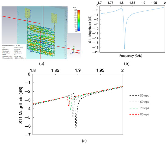 The IDTs were also modelled using CST Microwave Studio Suite 2022, 3D EM analysis software, with the structures excited by plane waves to obtain their resonant frequencies (Figure 7a). The experimental resonant frequency dip of the sensor is shown in Figure 7b. A liquid droplet consisting of water with a fixed volume and varying permittivity was then placed on the IDT, at the previously described optimal location, to replicate the effects of different concentrations of glucose in sweat. This simulation revealed frequency shifts, with the resonant dip decreasing in frequency as permittivity increased, as shown in Figure 7c. Inevitable geometrical alterations due to the embroidery process, such as small defects between adjacent stitches, result in frequency differences between simulated and experimental values. However, the magnitude of the frequency shifts in both the simulations and experiments were comparable, validating the simulation model.
