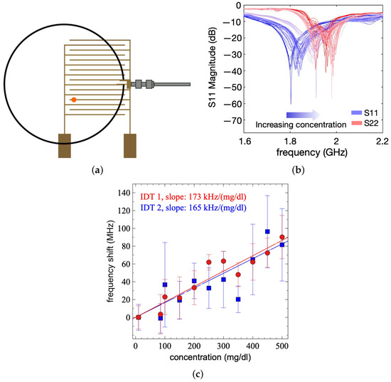 As a case study, droplets with various concentrations of glucose within the physiological range (10 mg/dL to 500 mg/dL) were used in subsequent experiments. The concentration range was selected to assess the sensor response within a range wider than the expected glucose concentration in the blood to assess the linearity. Samples were prepared by mixing DI water with glucose at various concentrations. Each droplet of glucose was placed onto the sensor in the highest sensitivity region (Figure 8a) and the frequency response was measured. A pair of IDTs were used in these experiments to compensate for the ambient variations that may affect the resonant frequency of the sensors. Specifically, the sensing IDT was connected to the first port. Droplets with varying concentrations of glucose were applied to the surface while S11 spectra were obtained. A control IDT was connected to the second port, and DI water droplets were placed on its surface while its S22 spectra were obtained.