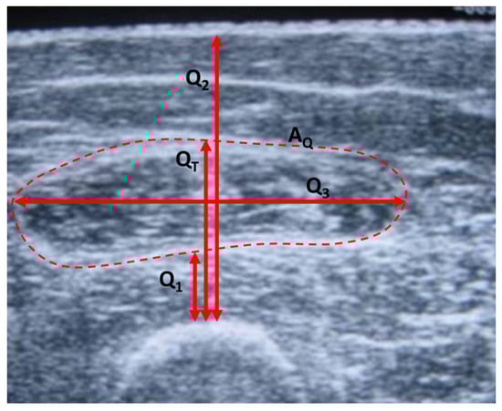 - Measurements: The reference measurements of muscle dimensions were carried out by ultrasound using an Aloka SSD-900 Ultrasound Machine (ALOKA Co. Ltd., Tokyo, Japan). Procedure: The patient was placed in a supine position, with a rolled towel under the popliteal fossa to relax the thigh. The transducer was placed with the long axis perpendicular to the longitudinal axis of the rectus femoris muscle, at the midpoint between the anterior superior iliac spine and the superior edge of the patella. Using the device’s software, the area and dimensions of different muscle sections were estimated, recording the data for subsequent analysis. The following measurements were obtained, referring to the image in Figure 1: thickness of the vastus intermedius (), length from the femur to the upper limit of the rectus femoris (), length from the femur to the skin (), transverse thickness of the rectus femoris () and area of the rectus femoris (). Isometric strength is defined as a static contraction without a change in muscle length. To measure this strength, the subject was seated and with a knee flexion of 90°. The knee was extended against static resistance and the isometric quadriceps strength was established using an isometric dynamometer. The isotonic force was evaluated through the 1RM test, defined in this case as the maximum weight that an individual sitting and with knee flexion of 90º can lift in a single repetition. For bioimpedance measurements, the adapted device described in the present work was used following the measurement protocol described in Section 2.1.