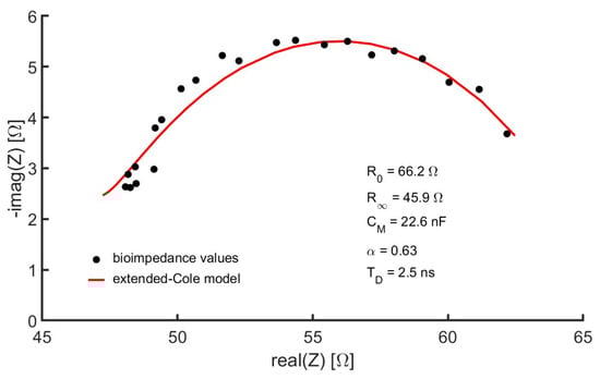 Table 1. Parameters of the extended-Cole model obtained from the complex bioimpedance values.The equations that define the extended-Cole model are the following, with being the angular frequency that corresponds to and f the frequency in Hz:According to [39], the equivalent circuit of Equation (1) without taking into account corresponds to the diagram shown in Figure 3, which includes a constant-phase-angle impedance .