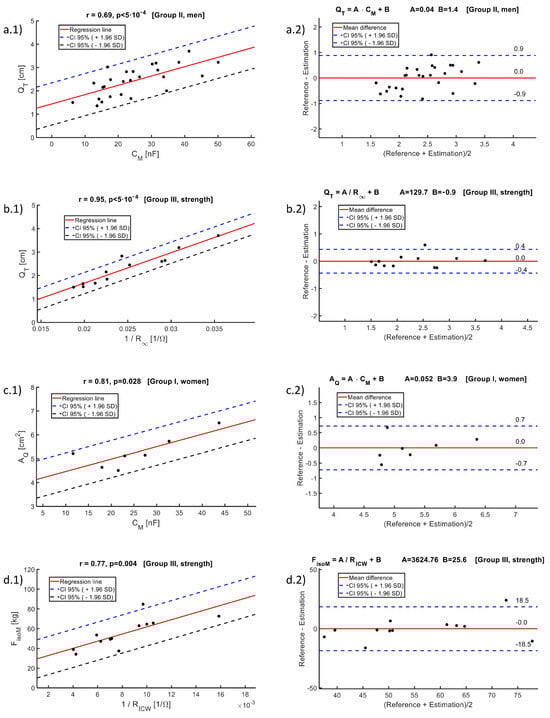 (a) Correlation of with respect to in Group II (men). (b) Correlation of with respect to in Group III (strength subgroup). (c) Correlation of with respect to in Group I (women). (d) Correlation of with respect to in Group III (strength subgroup). (x.1) Correlation graph. (x.2) Bland–Altman’s analysis based on the regression estimations.
