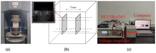 In Figure 3a, in order to obtain the compressive strength of concrete, three specimens were randomly selected on the 1st, 2nd, 3rd, 4th, 5th, 6th, 7th, 10th, 14th, 21st, and 28th days, respectively, and a 300-ton oil/electric hybrid servo pressure testing machine was used for the compressive test, which complied with the Chinese National Standard GB/T 50081-2019 [35] (Standard for Test Method of Physical and Mechanical Properties of Concrete). In addition, three specimens were selected to embed sensors inside, as shown in Figure 3b,c, showing the strength-monitoring device at room temperature.