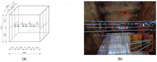 (a) Scheme and (b) Position diagram of the piezoelectric sensors and the thermocouples inside mass concrete.