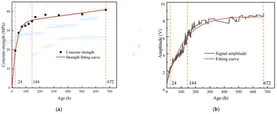 The piezoelectric signal detected at each age (0–672 h) within 28 days under standard curing was measured for each concrete specimen. The abnormal signals were eliminated. The average of the three sets of experimental results was calculated as the final piezoelectric signal, and then fitted using the least squares method of the exponential function (Figure 6b).