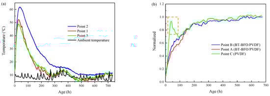 To concentrate the effect of the internal temperature on the piezoelectric signal, the received voltage signal of different sensor types was smoothed and normalized, with the 28-day signal amplitude used as the reference (Figure 7b). The BT–BFO/PVDF piezoelectric sensors at the center and measuring Point 1 showed a similar trend despite the temperature disparity. This was consistent with the variation pattern of the concrete specimen shown in Figure 6b. However, the piezoelectric signal of the traditional PVDF sensor peaked at 38 h of mass concrete ageing, which was close to the time of the maximum temperature of measuring Point 3. The piezoelectric signal coincided with the temperature peaks, indicating that the traditional PVDF was sensitive to the temperature changes. Moreover, strength monitoring was greatly affected by the temperature when PVDF was used as a sensor.