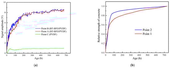 Figure 8b illustrates the strength development curve of each measuring point in mass concrete using the maturity method. The calculated internal strength of Point B was higher than that of Point A. The early strength development and temperature are closely related. A higher temperature meant a more intense hydration reaction, which promoted the early strength development of concrete. The slight difference in internal strength was captured by the BT–BFO/PVDF sensor, verifying the sensor monitoring accuracy. Furthermore, the piezoelectric signal of different measuring points gradually tended to become consistent after 7 days (Figure 8a), indicating a relatively uniform internal concrete strength.