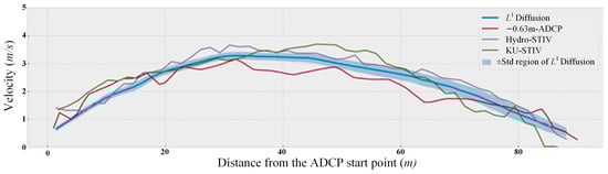 Comparison of velocity distribution inferred from different algorithms along the channel section. The Hydro-STIV [29] and the KU-STIV [3] represent the surface velocity acquired from different software based on the STIV method, and the L1 Diffusion [1] is the velocity acquired from variational method-used video [1].