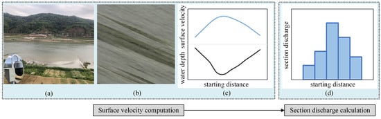 A typical workflow of a video-based river discharge measurement technique: (a) capturing water surface images using cameras; (b) extracting the tracer information (e.g., STIV); (c) calculating the velocity distribution; and (d) summing the subsection discharges.