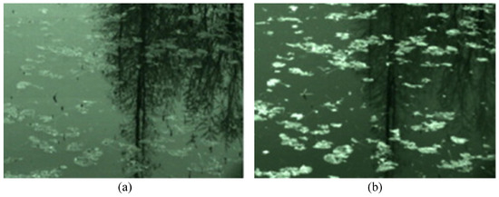 River surface images with different spectral bands [46]: (a) full-spectrum band; and (b) NIR band.