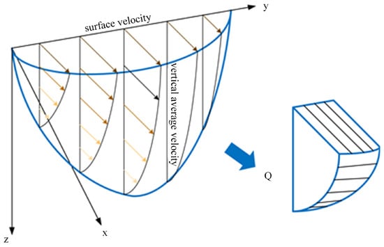 where v is the surface velocity, v′ is the average velocity of each corresponding vertical line, and the surface velocity coefficient α is the ratio of the vertical average velocity to the surface velocity, which is mainly affected by the distribution pattern of the vertical velocity and takes a value usually varying between 0.70 and 0.93 [55]. The vertical line divides the cross-section into n parts, the flow enclosed by each part is Qi, the area is Ai, and ω is the bank flow coefficient, ranging from 0 to 1, with steeper slopes approaching 1.