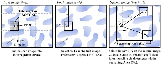A common algorithm implemented in LSPIV is mutual correlation: (1) two images with a known time interval of Δt are extracted and processed as input from the streaming video; (2) a block of source pixels called the interrogation area (IA) is read in the previous image; (3) correlation is computed for a window of the same size within a larger search area (SA) selected in the next one, and the pair of windows with the largest value is assumed to be the most probable displacement of the pattern between the two consecutive images (Figure 6); (4) finally, the average displacement of the particles within the window is calculated, and the velocity vector is obtained by dividing the displacement vector by Δt. The size of SA may be as large as the image and can be defined by the user, but it is usually limited by the measurement or estimation of the maximum velocity expected on the water surface [62]. The expression of the 2D discrete cross-correlation function is as Equation (6). Then, numerous studies have been conducted to improve LSPIV, as shown in Table 1.