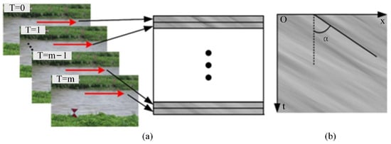 Fujita et al. [3] introduced the water surface spatio-temporal image into river measurements for the first time and detected the main direction of texture in the spatio-temporal image using the Gradient Tensor Method (GTM) to obtain the one-dimensional time-averaged surface velocity, which was named STIV. Compared with LSPIV, the significant progress of this method is that it does not need to use tracer particles. Instead, it relies on the formation of a space-time image using water surface flow features, such as ripples and corrugations. The surface flow velocity is determined by analyzing changes in grayscale on the image. The process of STIV is as follows: a series of parallel and equal-length velocimetry lines are set up along the direction of the water in the captured video of the river flow and the gray level of each velocimetry line is extracted frame-by-frame from the video. The grayscale information of each line is arranged sequentially to synthesize the space-time image of the line. In each space-time image, the change in the brightness of the river surface will be presented as an approximate parallel band texture. Then, the size of the surface velocity can be deduced by solving the angle between the band texture and the vertical direction (Texture Angle) [4], as shown in Figure 7.