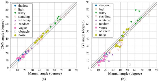 Comparison with manually confirmed angles: (a) CNN; (b) gradient tensor method [29].