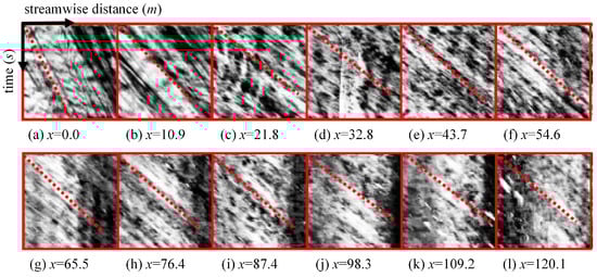 The inaccuracy of algorithm parameters is reflected by the subjective assignment of certain parameters by the researchers, often reliant on experiential judgments, resulting in coarse parameter values. Further in-depth research in this area is warranted. For STIV, the window size parameter in the GTM and the intensity coefficient parameter M in the QESTA are both generally taken as 15. However, the same space–time image can be divided into different numbers of windows with different window sizes. The region where each window is located is not the same each time, and the textures contained in them are not the same. An STI section with a window width of 10.9 m is shown in Figure 10, where a difference in the main texture orientation of each small window can be seen. Thus, the recognition of the angle obtained is inevitably not the same when taking different values of the window size. Similarly, taking different values of M results in different strengths of the logarithmic polar transformation relationship, resulting in a change in the gray value of the image. This indicates that the parameter values will have a great impact on the angle recognition results, and the optimal values of the parameters are not fixed; different image features will have different optimal parameters. Therefore, the velocity recognized by the GTM and the QESTA may not be truly accurate. For the conversion of velocity to discharge, the surface velocity coefficient is also empirically taken and cannot match the individualized needs of each monitored river [82]. Therefore, the magnitude of the possible error cannot be predicted. For deep learning algorithms, the accuracy of their parameters is related to many factors, such as the size of the dataset, the representativeness of the dataset, and the degree of model training. In addition, considering the complex flow characteristics of rivers and the variable outdoor measurement environment, outliers in the calculation results are almost inevitable. How to deal with the calculated outliers according to different measurement situations is still a problem worth studying and discussing.