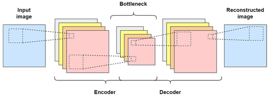 A convolutional autoencoder (CAE) is a neural network with convolutional layers that can be used as a feature extractor with images as its input and reconstructs the input at the output. The architecture of the CAE is quite similar to that of traditional autoencoders (AE) [16]. Convolutional layers often contain far fewer parameters than fully connected layers because of the sparse connection and weight sharing, which lowers the danger of overfitting. Therefore, CAE is selected in the proposed model. The two primary components of a CAE’s architecture are the encoding section, which compresses the input to reflect its features, and the decoding part, which reconstructs the input from the compressed form. Convolution and max pooling layers are part of the encoding process, whereas deconvolution and upscaling layers are part of the decoding process [17]. A representation of the CAE architecture is shown in Figure 1.