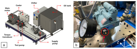 The experiments were conducted in a test setup of the hydraulic axial piston pump. Specifications of the pump are listed in Table 2. Images of the experimental setup (a) and the tested pump (b) are illustrated in Figure 5. A three-axis accelerometer sensor is installed on the case of the pump to measure the vibration signal. The sensor measures three row vibration signals along the X, Y, and Z axes, as indicated in Figure 5b.