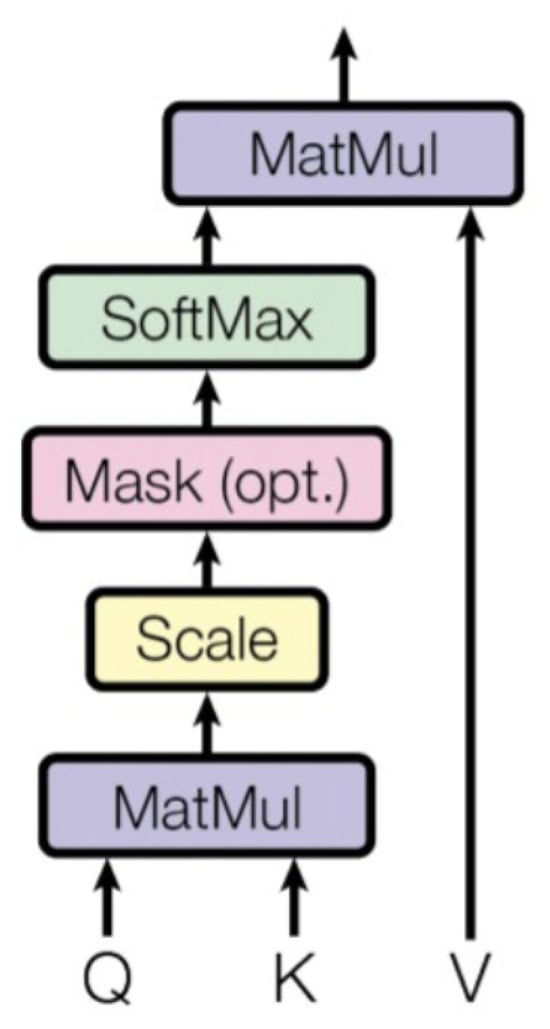 Consequently, the score in this attention mechanism signifies a measure of correlation or similarity between a Query and a set of keys [41,60]. These scores indicate how strongly the model focuses on different locations or elements based on the correlation between the Query and the Key (Equation (1)), facilitating effective weighted input data aggregation. This is one of the reasons why the self-attention mechanism finds utility across various tasks, as it captures complex relationships and dependencies in data (Figure 4).
