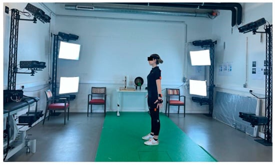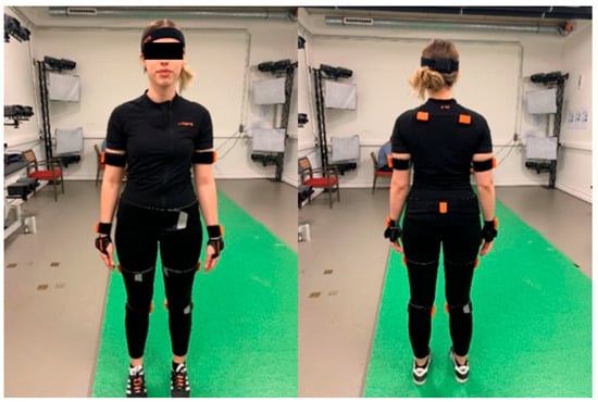 During this study, two different motion capture tools of the 4D4ALL lab were considered: the Move 4D (IBV, Valencia, Spain) dynamic scanner device and the wearable mocap system Xsens (Movella, Henderson, NL). The Move4D scanning volume is 2 m (width) × 2 m (depth) × 3 m (height). It is composed of 12 modules positioned on columns on a truss structure. It is equipped with built-in lighting systems (Figure 1 and Figure 2). The modules are composed of a combination of infrared and RGB cameras able to capture dynamic (3D over time) full-body shape variation and kinematics at 178 frames per second (fps) with an accuracy of less than 1 mm. At the same time, the second tool is a mocap system composed of 17 inertial wearable measurement units (orange units in the figures) attached partially to the human body by Velcro straps or attached to a smart shirt, gloves, and band as in Figure 1 and Figure 2. Both systems have been synchronized at 60 Hz and linked through a coaxial cable. The cable has been put in the output for Xsens and the input for Move4D. As soon as the capture with Xsens is launched, Xsens sends the trigger to Move4D to start the acquisition.
