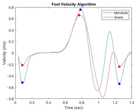 The amplitude of the foot center velocity of Move4D and Xsens show some differences especially in the initial and final heel strike. The reason can be related to the attachment of the Xsens sensor on the foot because it is places over the shoe. Despite that, our focus is on the time instants where hell strike and toe off occur which were similar in the two systems.