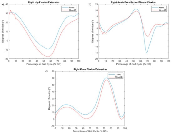A kinematic analysis was performed on the first trial. Figure 4 shows examples of joint angles, particularly hip and knee flexion/extension and ankle dorsiflexion/plantar flexion, obtained with Move4D and Xsens for a subject.
