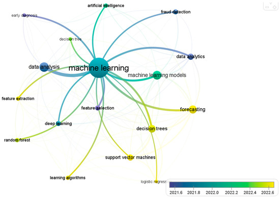 Figure 1 presents an analysis of the occurrence of words in the selected articles. The cooccurrence analysis of the words of the articles was performed according to the information that was exported from the Scopus database. Information such as citation information: “Author(s), Document title, Year, Source title, etc.”, bibliographical information: “Abbreviated source title, Affiliations, etc.”, abstract and keywords: “Abstract, Author keywords and Indexed keywords”, funding details: “ Acronym, etc.”, and other information like “Conference information and Include references”. The color map in Figure 1 illustrates the frequency of recurring concepts found in the literature. It is inferred, then, that models such as Logistic Regression (LR), Support Vector Machines (SVMs), decision trees (DTs), data analytics (DA) and Random Forests (RFs) are base models used in ED or early diagnosis.