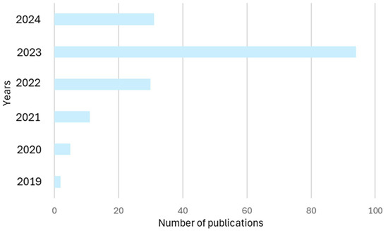 The number of publications per year between 2019 and 2024 is presented in Figure 2. One can see that during the years 2019 to 2023, the number of publications showed an increasing trend. The highest number of publications occurred in 2023, with precisely 94. Even though there are only 31 publications in 2024, it can be predicted that this trend will continue in 2024 as this field is relatively popular in research and manufacturing areas.
