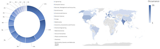 As can be seen, the most relevant areas are Engineering (21%), Computer Science (21%), and Business, management, and accounting (10%). Looking at the origin country of publications, the highest publication occurrence is in Italy (26 publications), and from the Asian continent, India has the greatest number of publications, with precisely 17.
