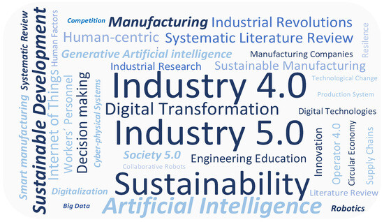 As can be seen from this figure, the most frequently occurring keywords are Industry 4.0 (76 times) and Industry 5.0 (58 times). This fact indicates, as mentioned in the Introduction section, that IR5 is a prologue to IR4, and due to this reason, they are closely related. The remaining significant keywords are sustainability, artificial Intelligence, sustainable development, manufacturing, etc.
