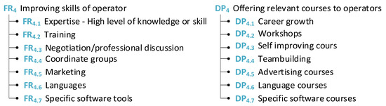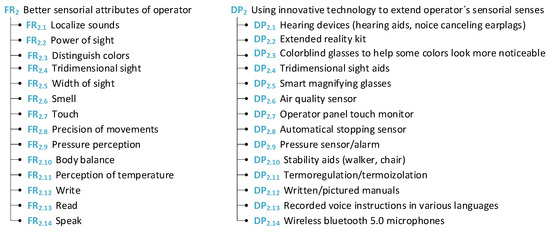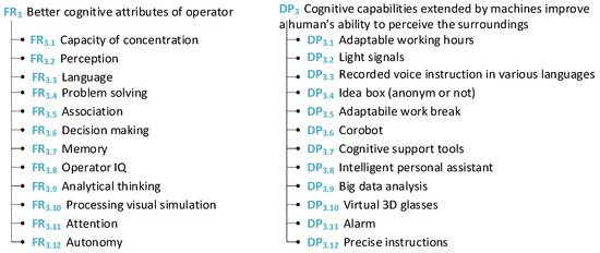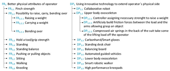 This subsection is dedicated to the worker perspective regarding the attributes of humans in the manufacturing process. The analysis is based on the AD theory. The highest levels of FRs and DPs, with their sub-levels from the physical, intellectual, and emotional points of view, are shown in the following figures.