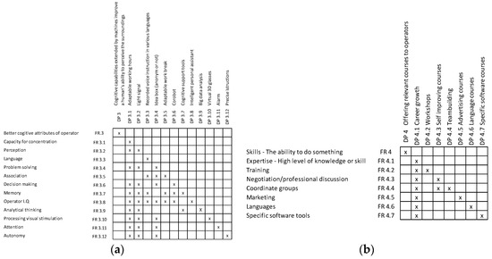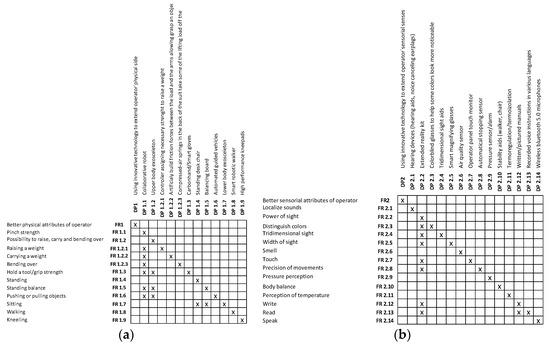 It is important to note that the method used is based on the AD theory to provide a so-called manual, and not a study design based on the usage of axioms. The structures are then supported and clarified by matrices for Figure 8a physical attributes and Figure 8b sensorial attributes of the operator, which provide insight into the link between the DPs and FRs from a physical perspective (see Figure 8). These matrices could be taken into account for decision making in the question of how to improve the physical and sensorial attributes of workers.