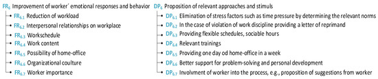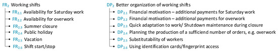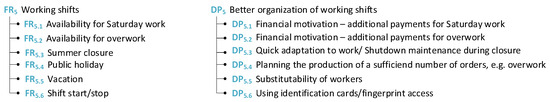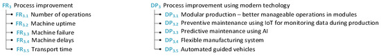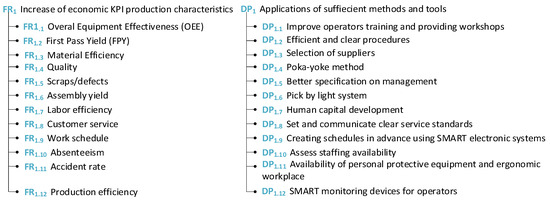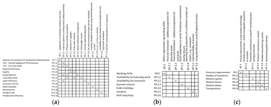 To clearly identify the link between the DPs and FRs, the following matrices for each high-level FR1–3–DP1–3 have been created. Namely, matrices for Figure 18a economic KPI production characteristics, Figure 18b workers shifts—factory view, and Figure 18c process improvement can be seen in Figure 18.