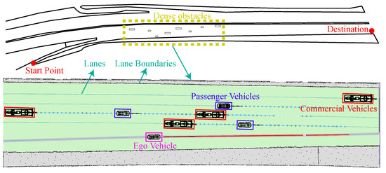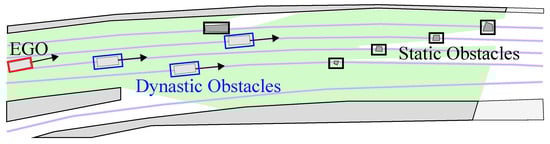 This study focuses on scenarios within complex urban road environments. As illustrated in Figure 2, the presence of static obstacles, dynamic obstacles, and road boundaries in the environment poses significant challenges for the trajectory planning of autonomous vehicles. The goal of trajectory planning is to find a smooth, safe, and efficient trajectory. Smoothness is quantified by curvature. Efficiency is evaluated by the vehicle’s traversal time through complex scenarios or its average speed. To ensure safety, there must be no collision with static or dynamic obstacles.