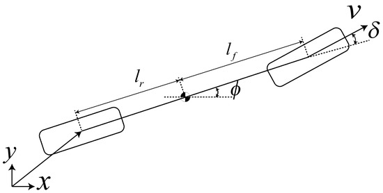 If flat outputs and their higher-order derivatives can smoothly describe a system’s state and if inputs can be identified then the system is considered differentially flat [32]. Vehicles are typically differentially flat systems. A simplified kinematic bicycle model is used to describe a four-wheel vehicle, assuming the model is not slipping, with steerable front wheels and fixed rear wheels. The model can be described as Figure 3. The state vector of the system is selected as